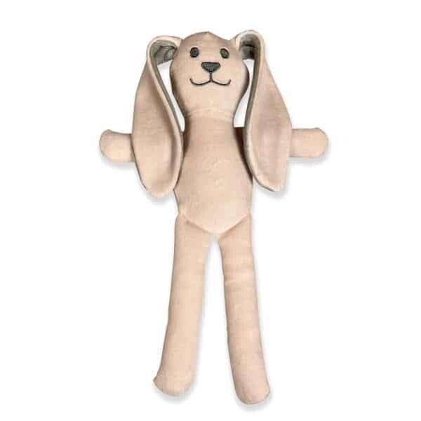 Deze leuke konijntjes met rammelgeluid kunnen aan de binnenkant van de oren worden bedrukt met bijvoorbeeld een naam en/of geboortedatum. Zo krijgt deze knuffel een nog persoonlijkere touch.