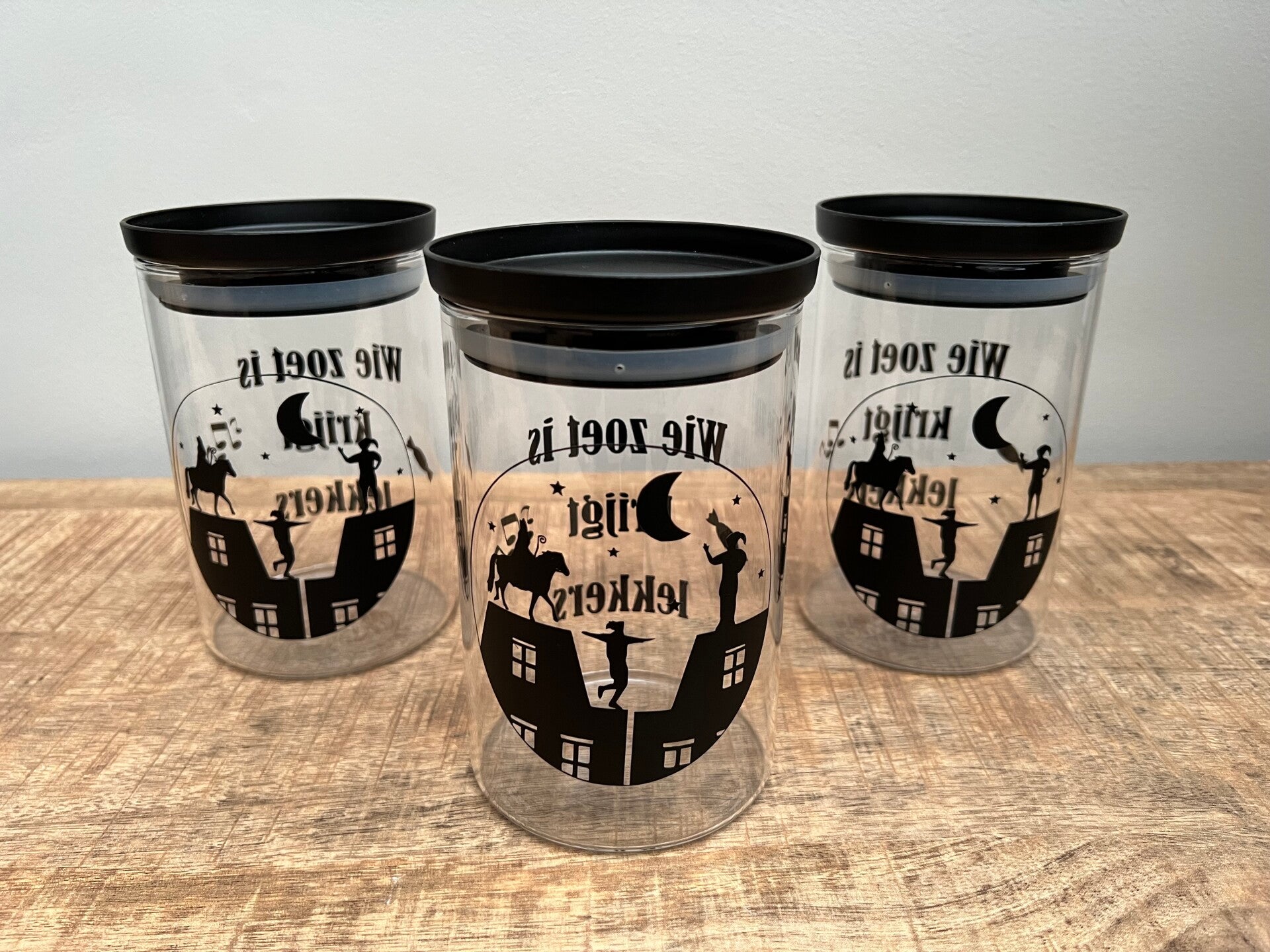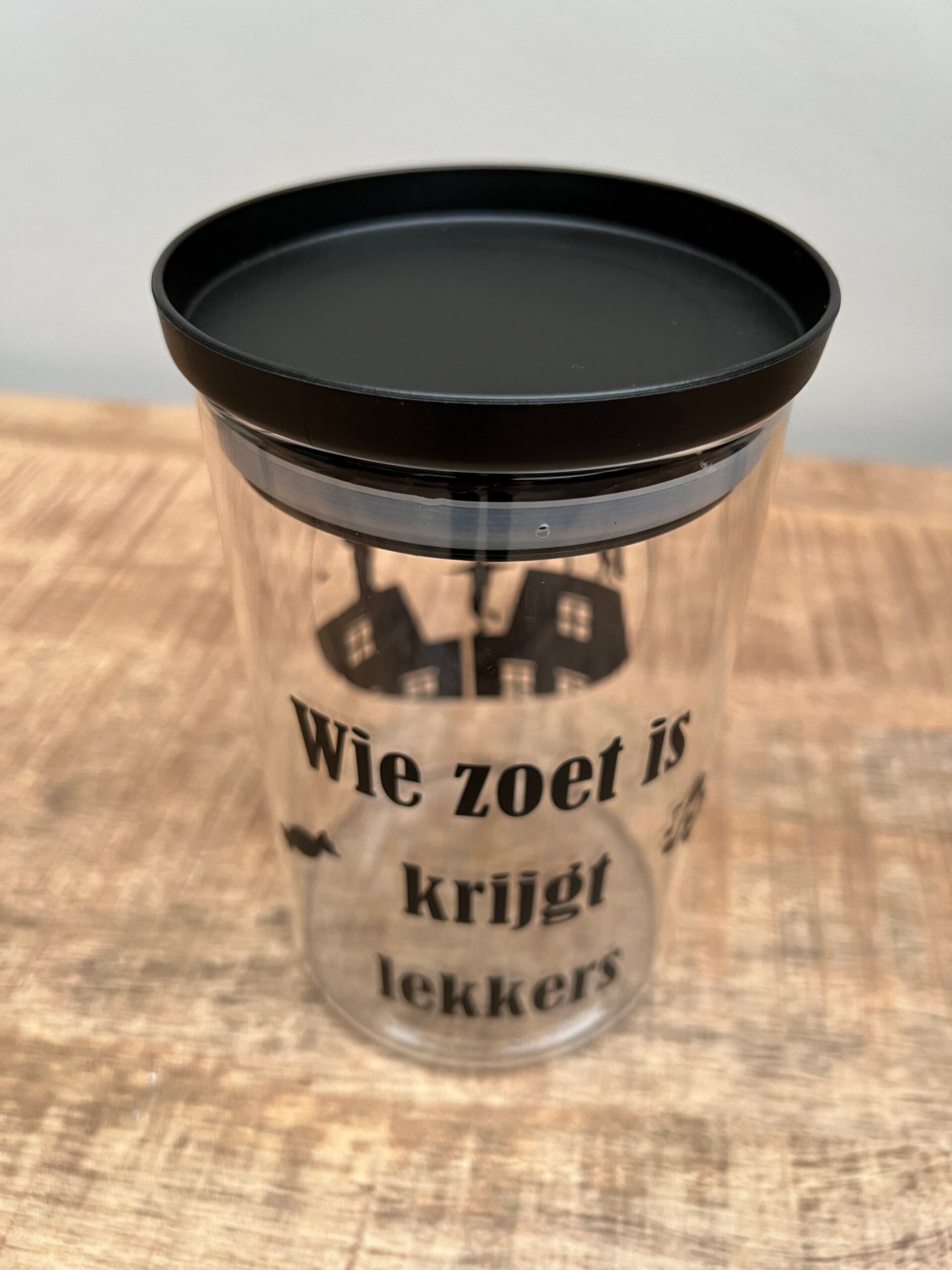 Een mooie glazen pot met afneembaar deksel. Deze is mooi bedrukt met een Sinterklaas afbeelding en aan de andere kant de tekst "Wie zoet is krijgt lekkers".