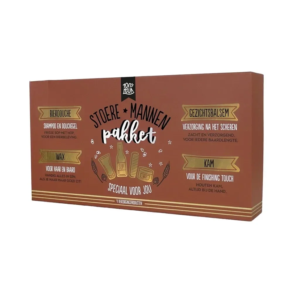 Het ‘Stoere mannen pakket’ heeft een luxe uitstraling en is een volwaardig cadeau waarmee je voor de dag kunt komen. Het pakket is gevuld met onder andere een bierdouche. Dit is een sop met hop en een shampoo + douchegel in één. Door de fris kruidige geur van Sweet Basil is dit het enige bier waar je frisser van wordt. Ook is er een zachte en verzorgende gezichtsbalsem voor na het scheren in het pakket te vinden. Een wax voor haar en baard én last but not least; een kam voor de finishing touch. Als je haar maar goed zit.