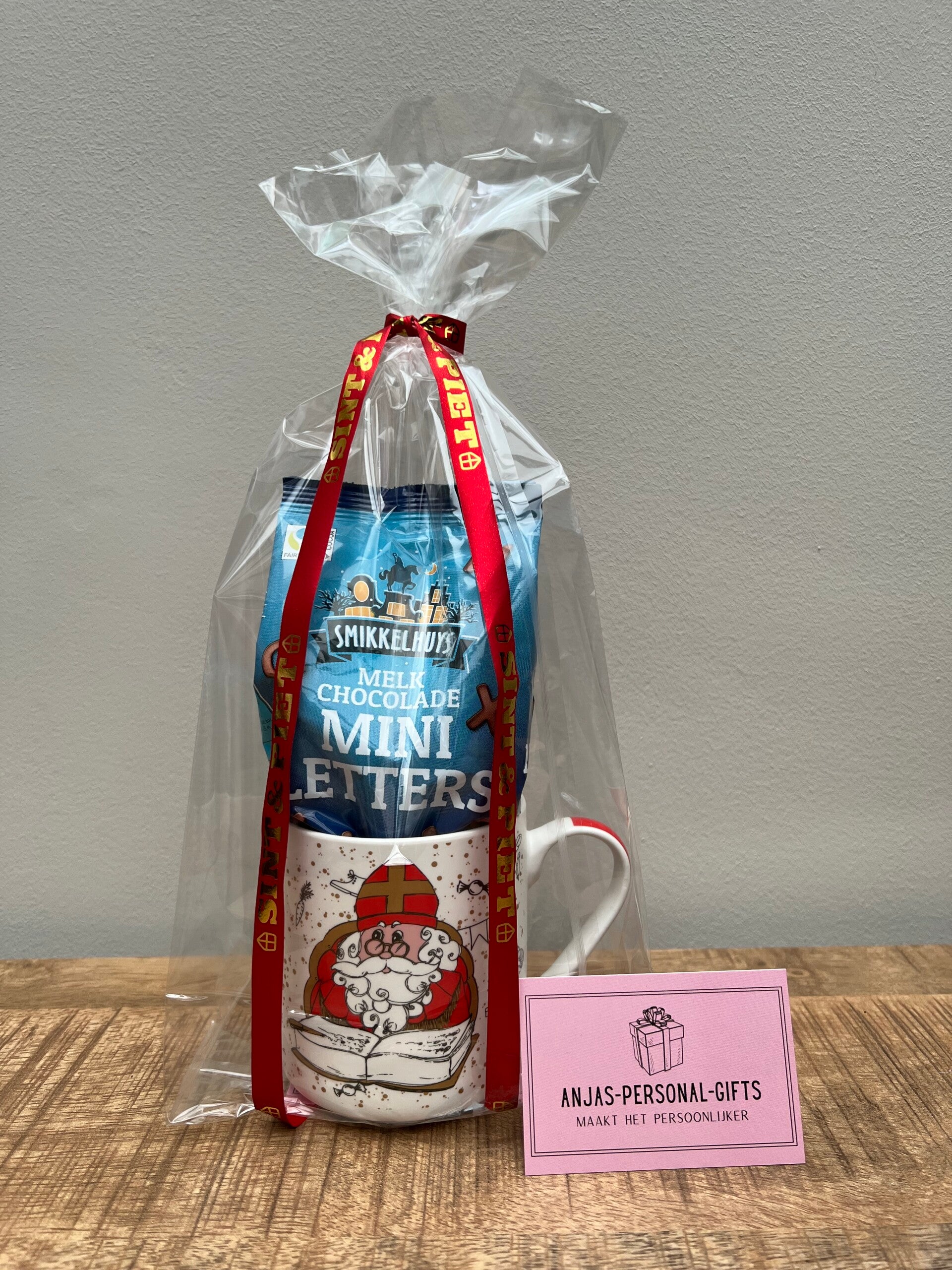 Deze leuke Sinterklaasmok is gevuld met een zakje mini chocoladeletters in de smaak "melk".