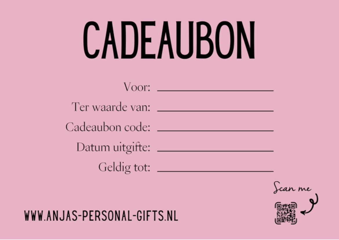 De cadeaubon van Anjas-Personal-Gifts is het ideale cadeau voor wie geen keuze kan maken. Met deze cadeaubon kan de ontvanger kiezen uit de gehele webshop! Ze zijn te bestellen in waarden van €5,- tot €50,- en bevatten elk hun eigen unieke code welke ingewisseld kan worden in de webshop. Geef in het opmerkingenveld nog even aan voor wie en voor welke gelegenheid de bon is en wij zorgen ervoor dat het een feestje wordt om de cadeaubon te geven en uit te pakken!