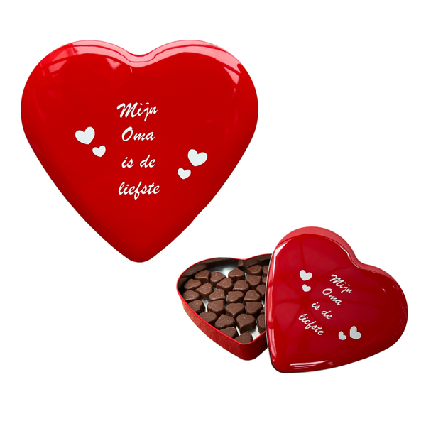 Doe dat dan eens met dit leuke rode blik in de vorm van een hart. Wij hebben het blik al gepersonaliseerd met de tekst: Mijn Mama is de liefste of Mijn Oma is de liefste. Het blik is gevuld met overheerlijke hartvormige Milka chocolaatjes.