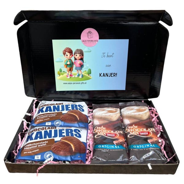 Het pakketje bevat 2x een chocolade "Kanjer" stroopwafel en 2x een zakje "Hot Chocolate Drink" en een leuke bijpassende wenskaart met uw persoonlijke boodschap.