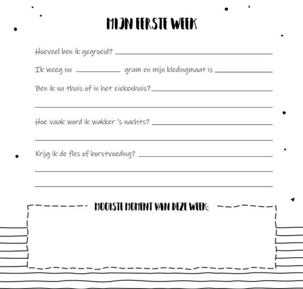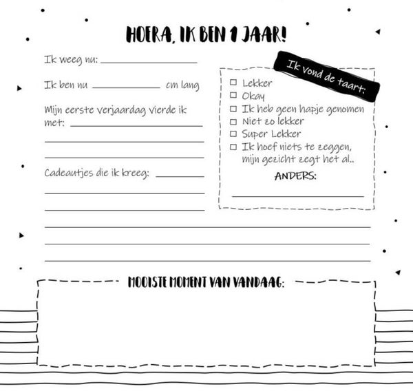 In het eerste jaar van je kindje gebeurd er heel veel, omdat ze zo snel groeien. Deze mijlpalen wil je natuurlijk zo veel mogelijk vastleggen. Wekelijks en maandelijks alle bijzondere gebeurtenissen bijhouden, kan nu in dit leuke/ hippe Baby’s eerste jaar invulboek. Erg leuk om bij het houden tijdens het eerste jaar van je kindje.