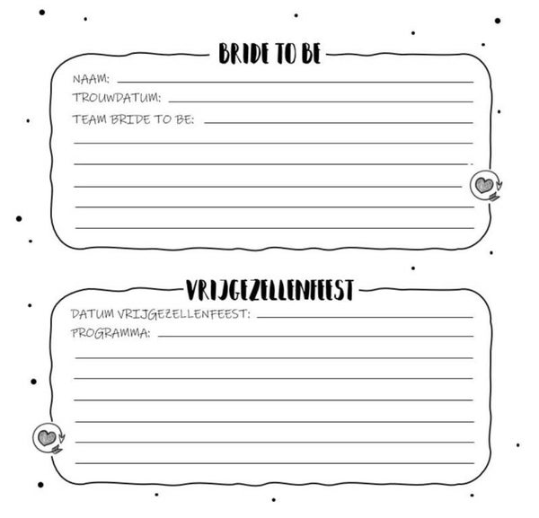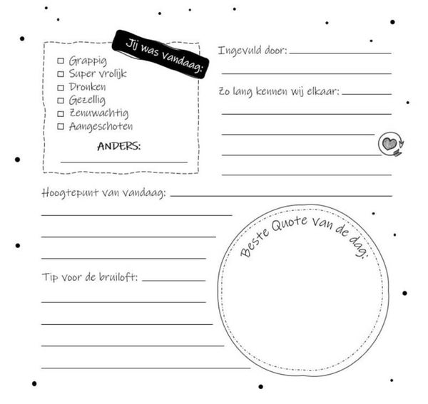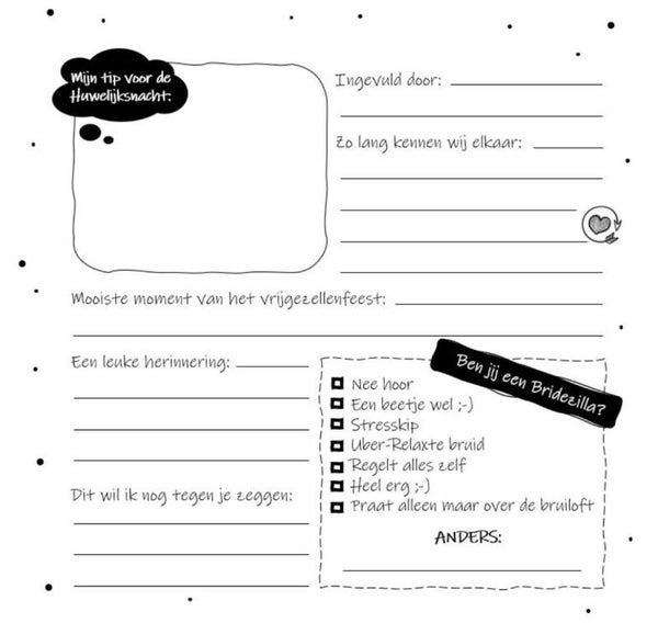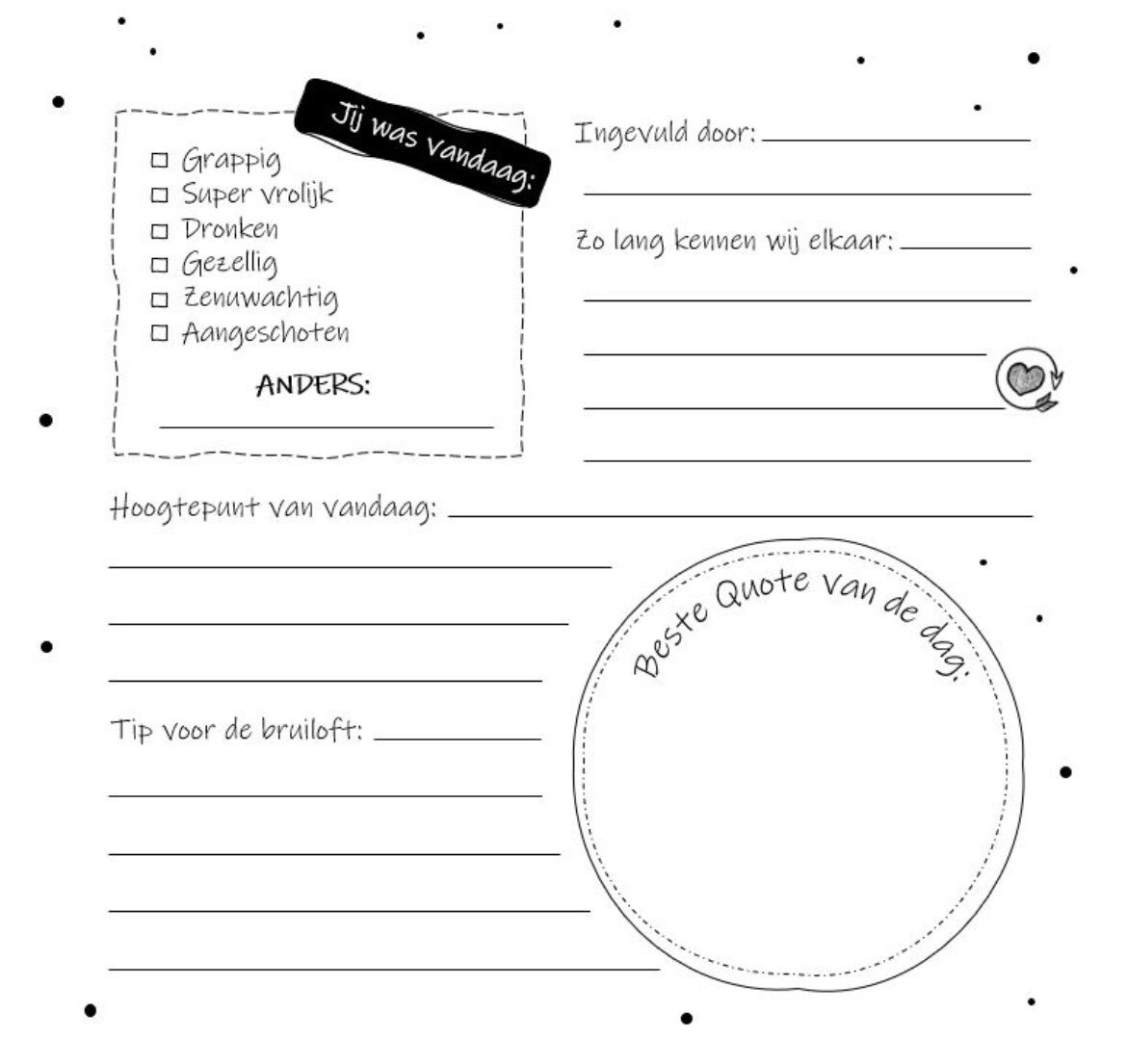 Het vrijgezellenfeest invulboek is een mooie en leuke herinnering aan deze leuke dag. Kortom een Musthave voor elk vrijgezellenfeest!