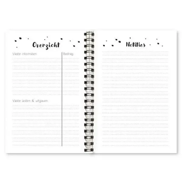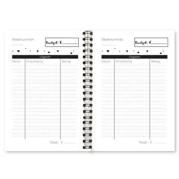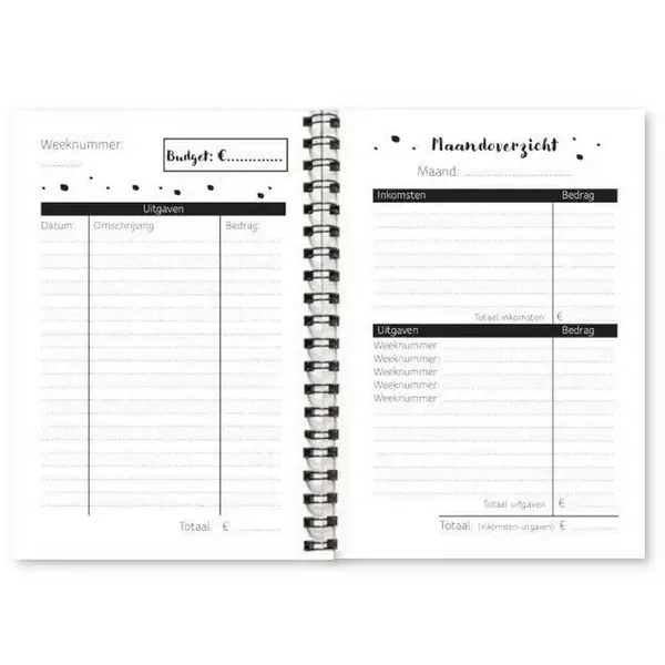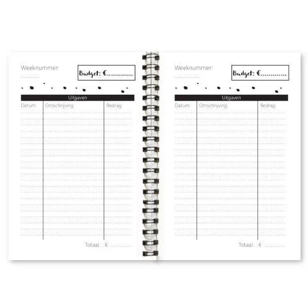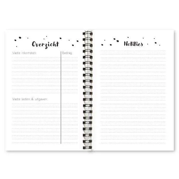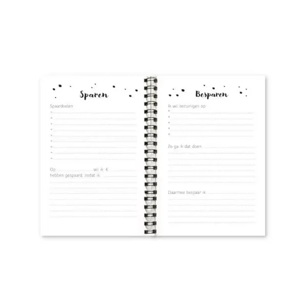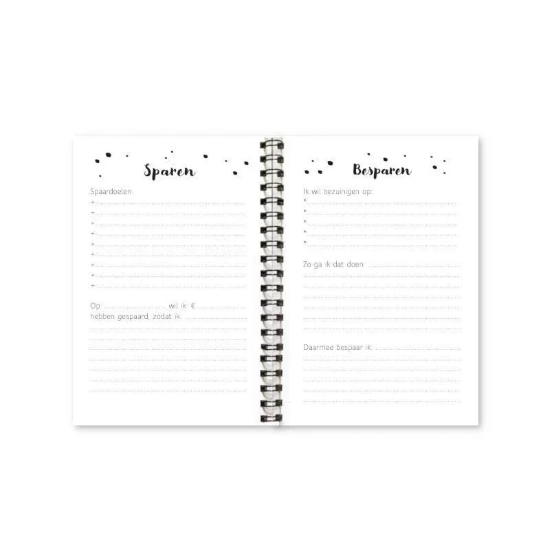 De planner begint met een aantal algemene pagina’s: overzicht, sparen en besparen. Zo kun je voor jezelf zien wat er maandelijks standaard binnenkomt en welk budget je daardoor hebt voor uitgaven. Ook kun je een plan maken om voor iets te sparen of om op bepaalde zaken te besparen. Daarna volgen 12 maandoverzichten met per maand 5 weekoverzichten. Je budgetteert per week wat je wilt uitgeven en schrijft op wat je echt uitgeeft. Vervolgens kun je in je maandoverzicht zien wat alle inkomsten en uitgaven van die bepaalde maand zijn geweest en of het resultaat is zoals je had gepland. Zo kun je op een overzichtelijke manier bijhouden hoe de financiële situatie is en kun je goed zien waar je nog geld kunt besparen zodat je meer geld overhoudt voor leuke plannen of doelen.