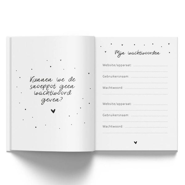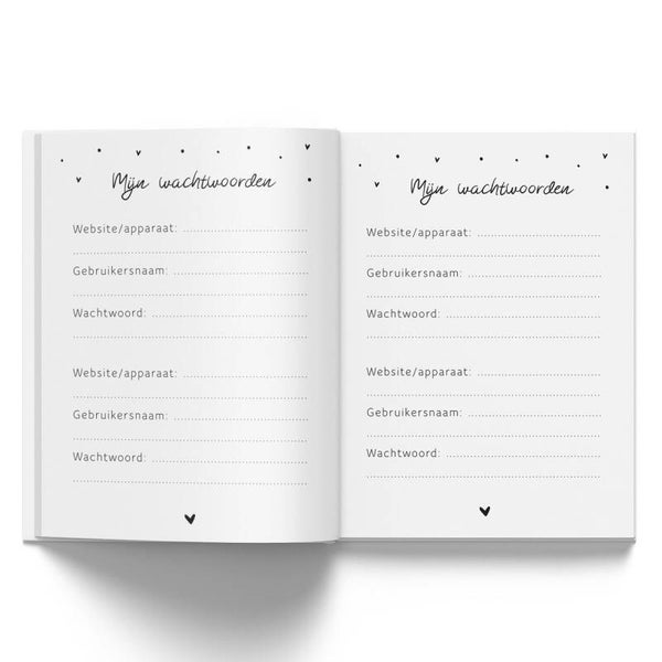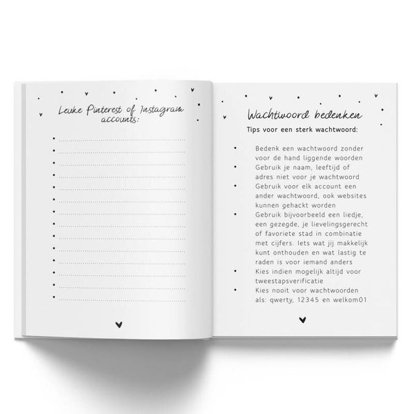 Naast dat je in het boekje je wachtwoorden kunt invullen, is het boekje nog veel uitgebreider! Het bevat namelijk pagina’s waar je je favoriete webshops, websites en Pinterest of Instagramaccounts kunt noteren. Ook is er nog genoeg plek voor notities. Verder bevat het boekje tips voor goede wachtwoorden en de WiFi. Je kunt voor al je wachtwoorden de website of het apparaat invullen, de gebruikersnaam en natuurlijk het bijbehorende wachtwoord. Er is plek voor maar liefst 54 wachtwoorden.