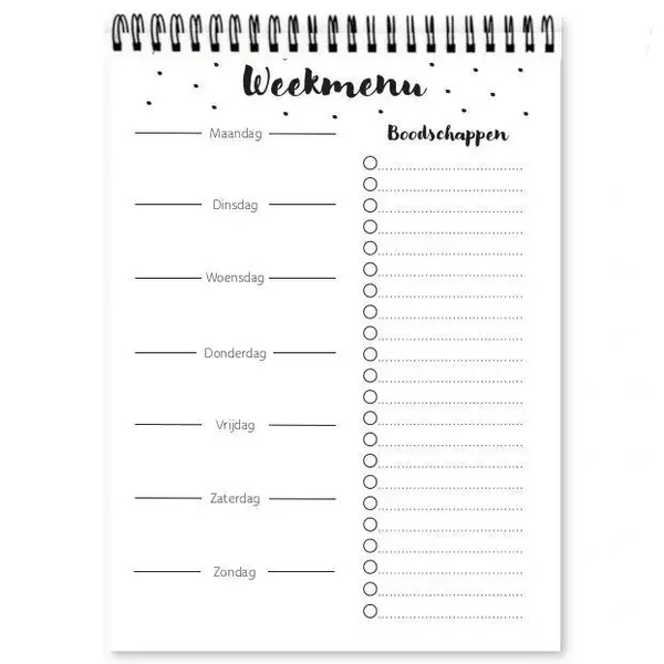 Deze weekmenu planner met boodschappenlijstje helpt je met het plannen van het eten voor de hele week en de boodschappen die hierbij horen. Als je eerst het weekmenu op schrijft, kun je daarna de boodschappen plannen. Je zult dan nooit meer de benodigde boodschappen vergeten en weet ook nog wat je hebt gepland om te eten. Super handig!