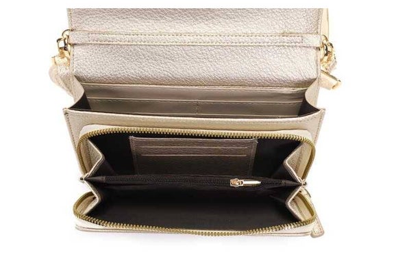 Deze stijlvolle portemonnee / tas biedt bovendien ruimte voor elke telefoon. Je kunt je telefoon kwijt in één van de twee voorvakken onder de flap. Deze flap wordt afgesloten met een druk magneet.