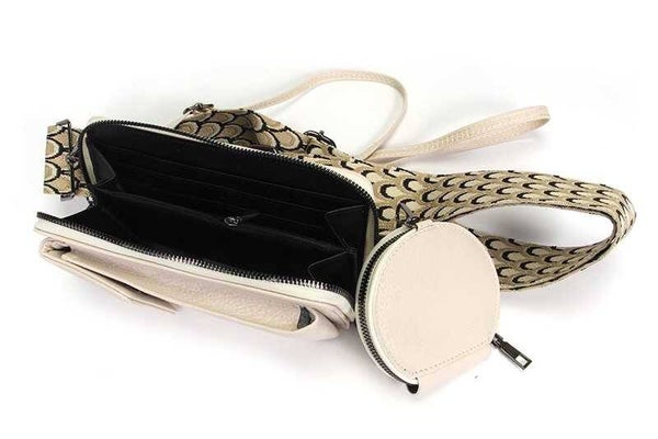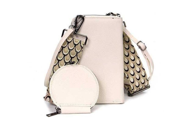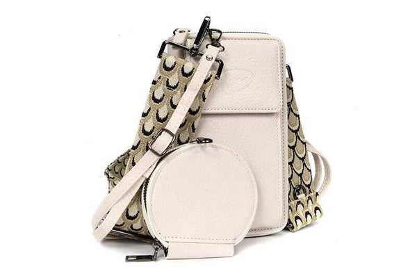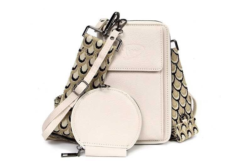 Het voorvakje wordt met een magneet afgesloten en biedt een veilige, maar toegankelijke plek voor je telefoon. De portemonnee wordt geleverd met twee verschillende schouderbanden, een vrolijke brede geweven band en een smallere effen schouderband.