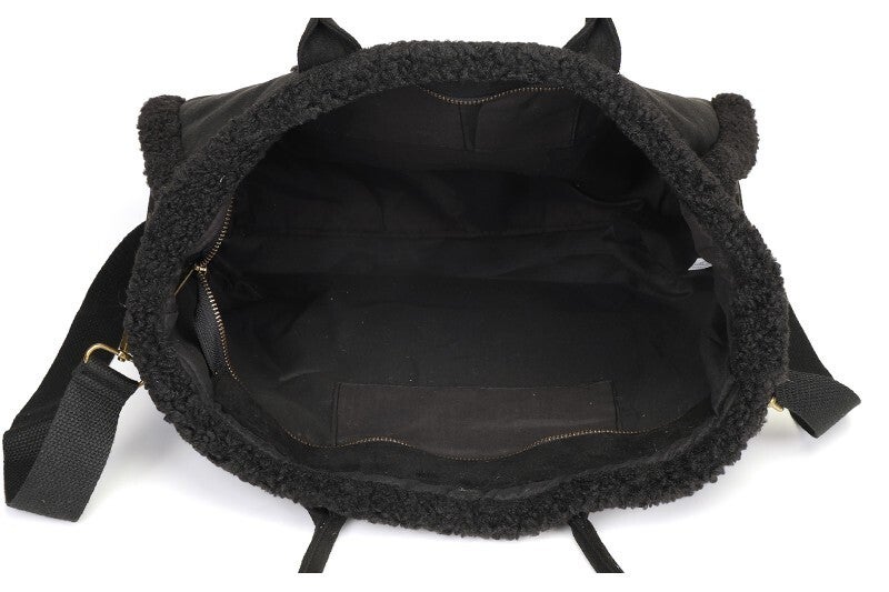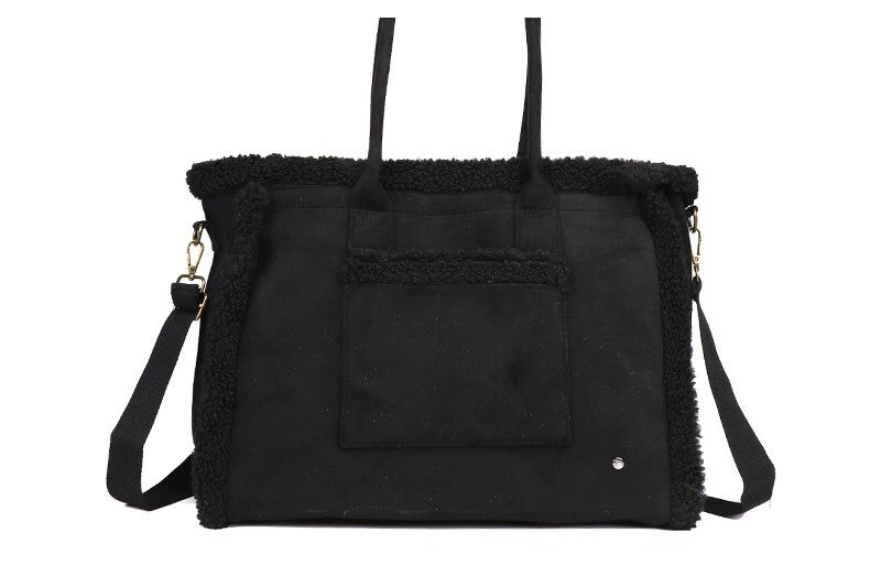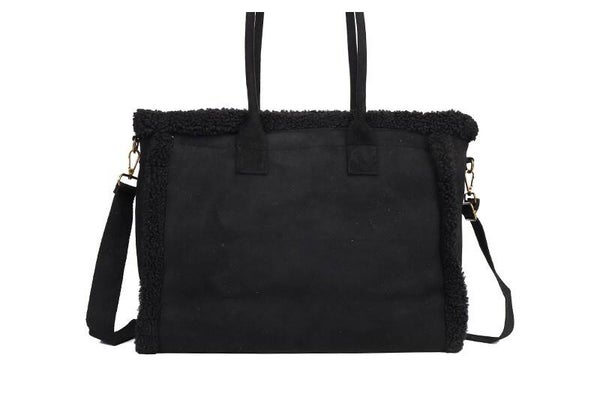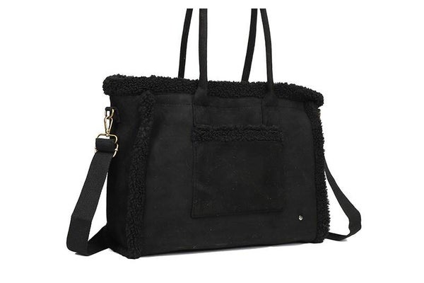 Deze ruime tas, afgewerkt met trendy teddy randjes, biedt zowel een chique uitstraling als praktische opbergruimte.