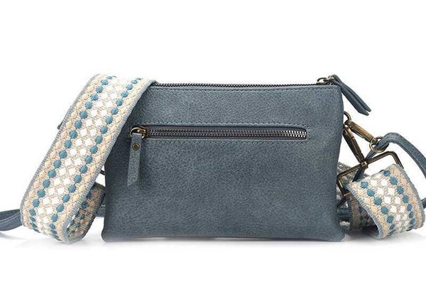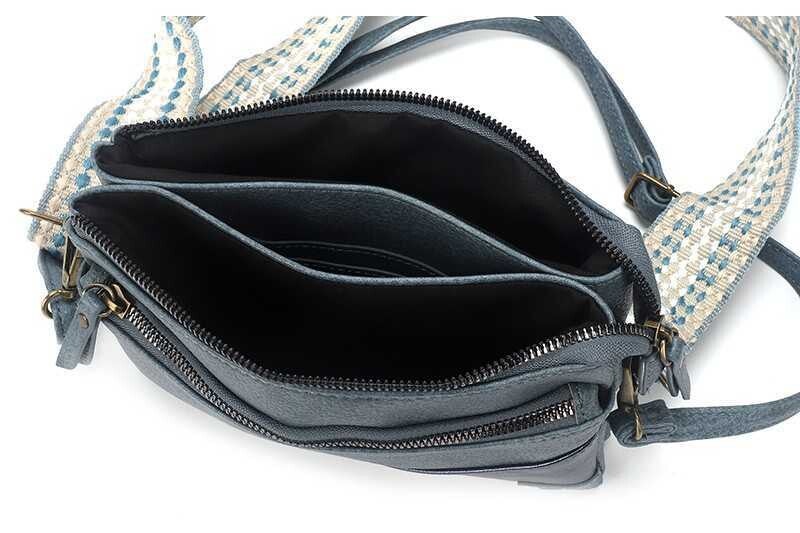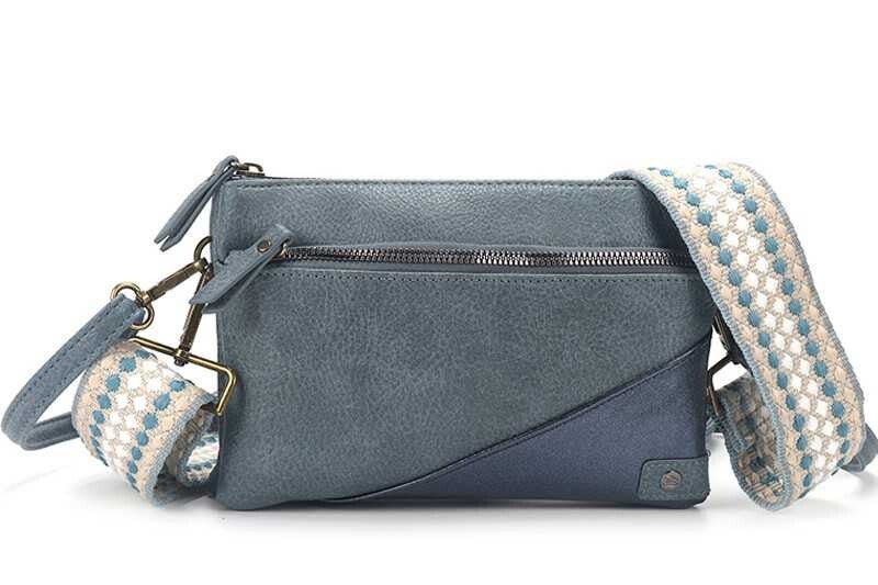 De tas valt gelijk op dankzij de royale vakken die afgesloten worden met een rits. Deze drie vakken zijn allen geschikt voor verschillende telefoons of andere waardevolle spullen. Tussen deze twee royale vakken, bevinden zich verschillende insteekvakjes voor pasjes. Aan de achterkant zit een vakje afsluitbaar met rits.